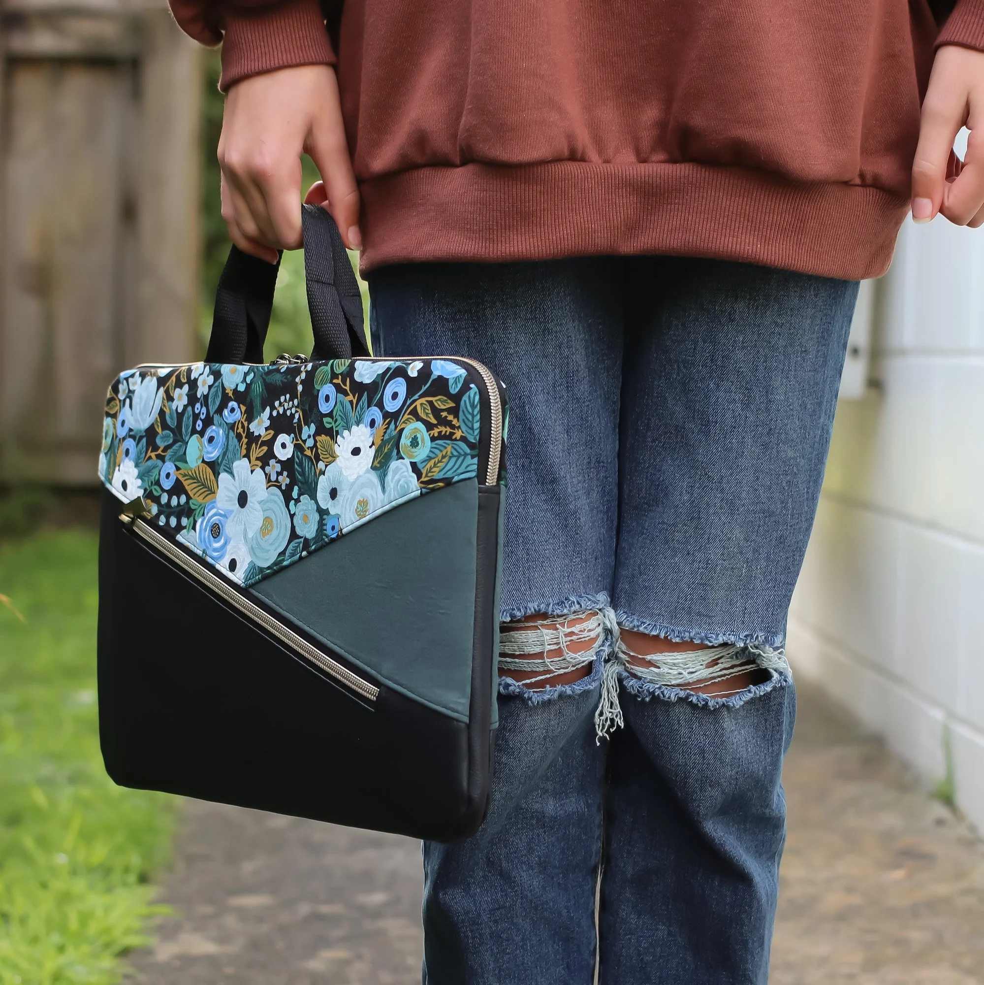 Materials used were quilting cotton and vinyl. Fully interfaced and lined with foam for protection.